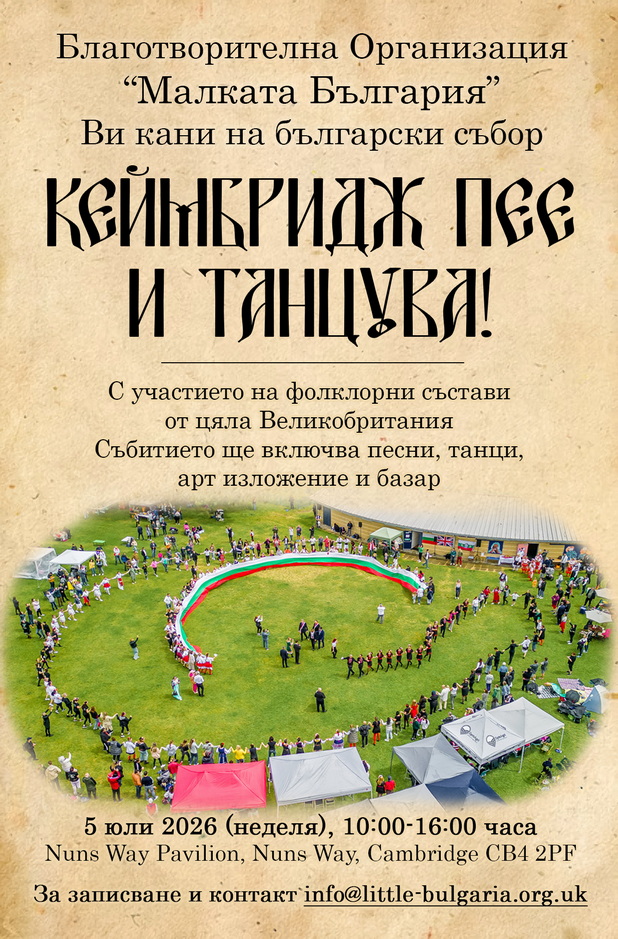 Благотворителна Организация „Малката България“ и партньори Ви канят на празничен събор-тържество на 5-ти юли 2026, под наслов „Кеймбридж пее и танцува!“.