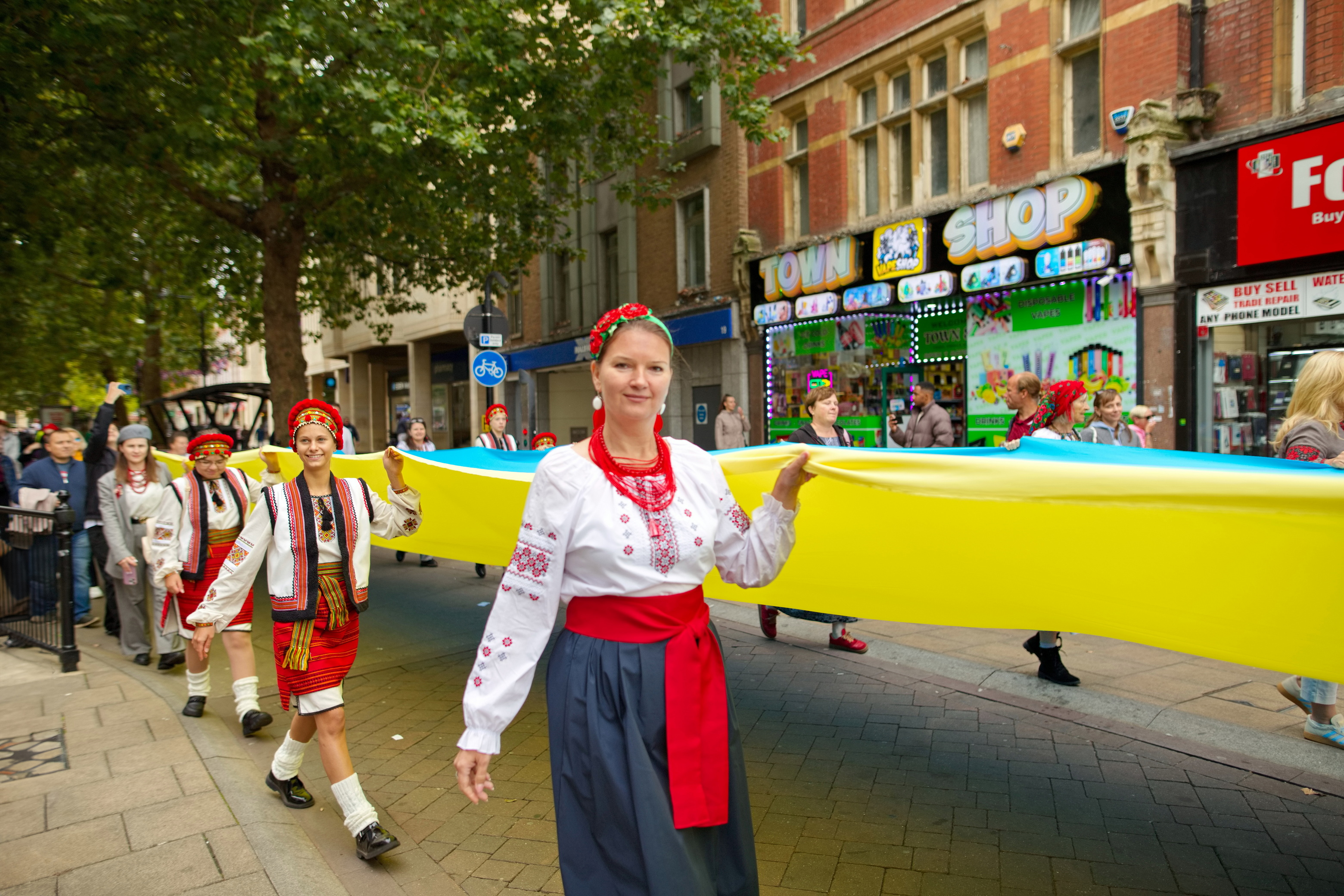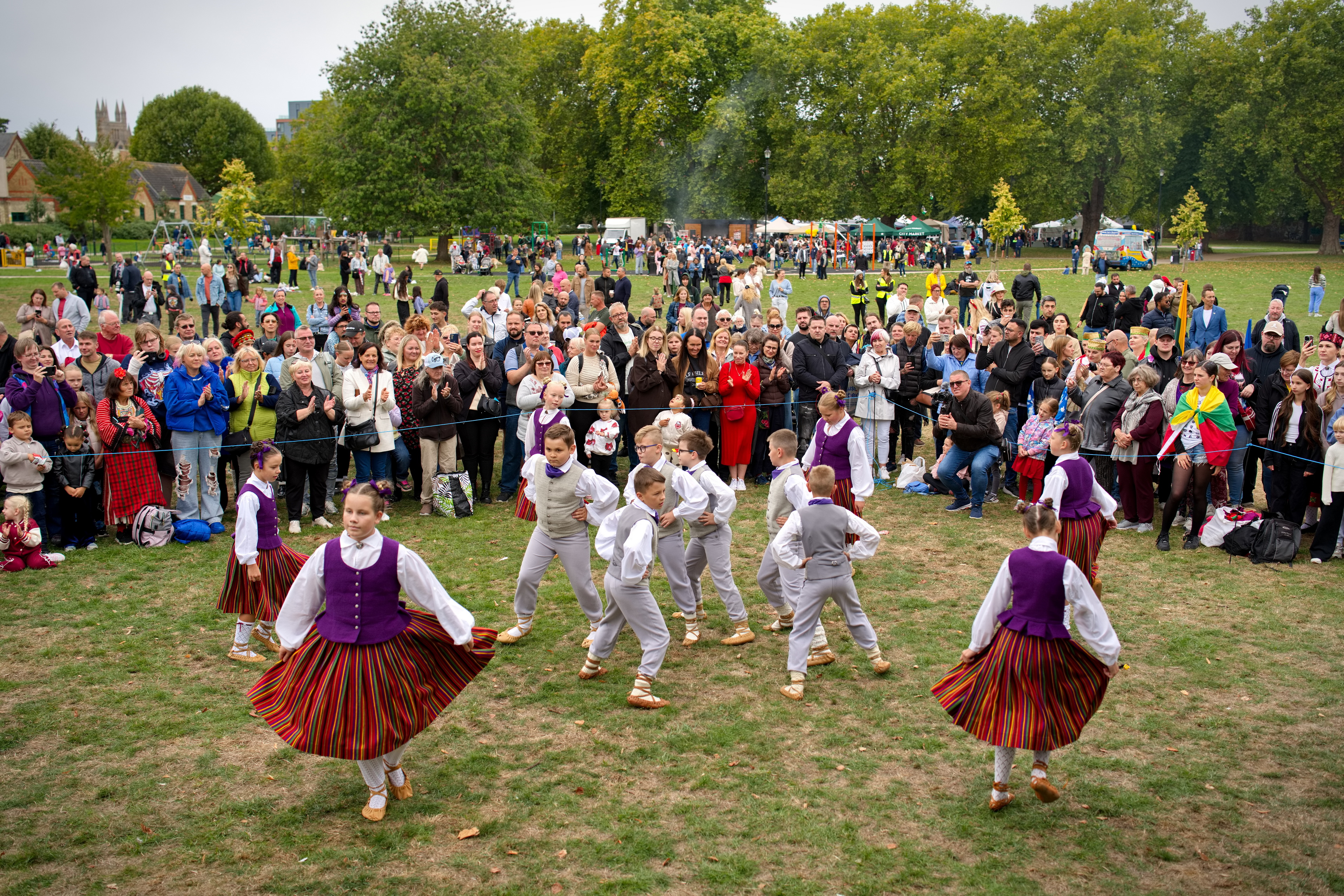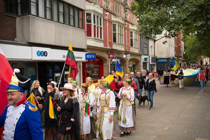 The morning started in front of Peterborough Cathedral—a place that carries its own spirit of history and community. All ensembles, flag bearers and volunteers gathered there. The square filled with colour: national costumes, flags, garlands, embroidered aprons and smiles. As the last groups arrived, musicians warmed up with short tunes, dancers exchanged steps and tips, and children curiously examined our outfits and embroidery.